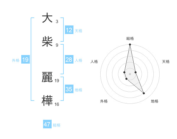大柴 麗樺さんの総格は47画の5点!