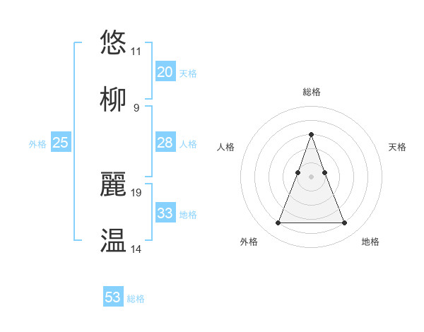 悠柳 麗温さんの総格は53画の3点!