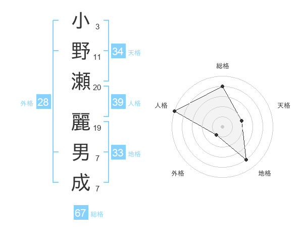 小野瀬 麗男成さんの総格は67画の4点!