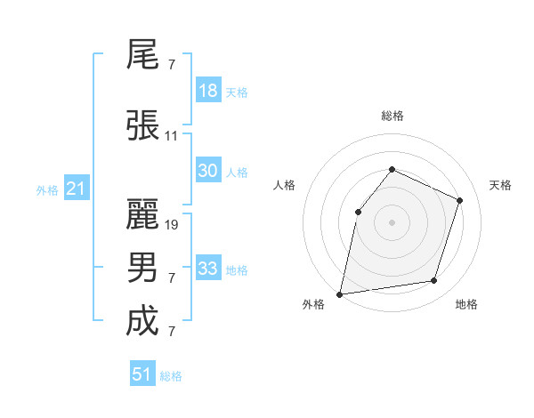 尾張 麗男成さんの総格は51画の3点!