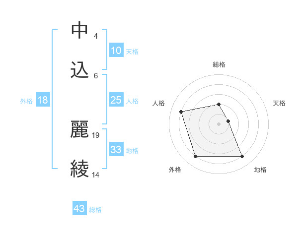 中込 麗綾さんの総格は43画の2点!