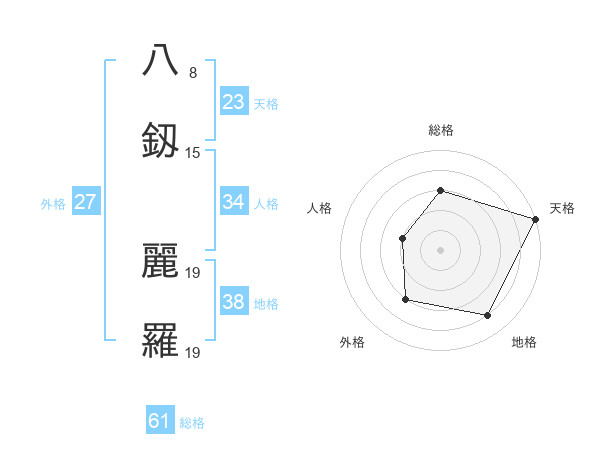 八釼 麗羅さんの天格は23画の5点!
