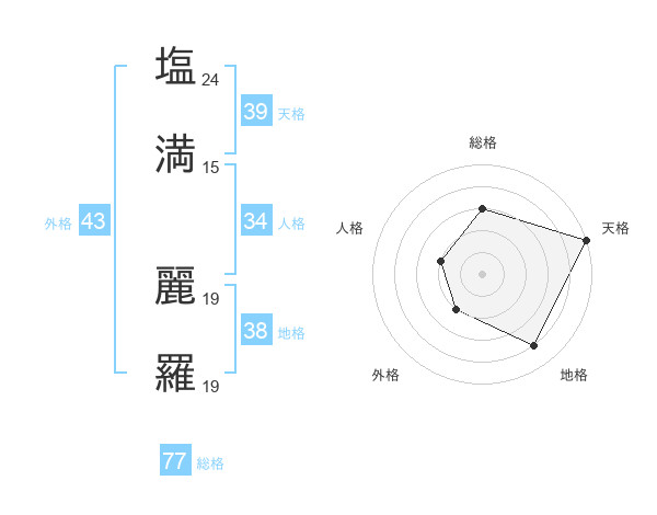 塩満 麗羅さんの総格は77画の3点!