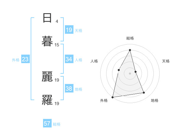 日暮 麗羅さんの総格は57画の4点!