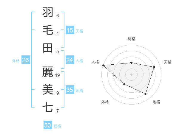 羽毛田 麗美七さんを姓名の画数から五運を鑑定