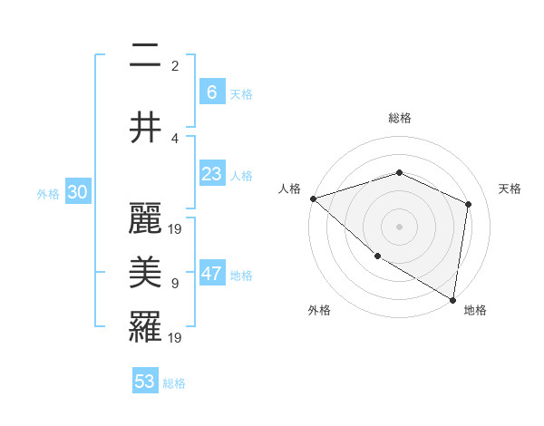 二井 麗美羅さんの総格は53画の3点!