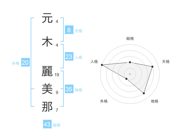 元木 麗美那さんの総格は43画の2点!