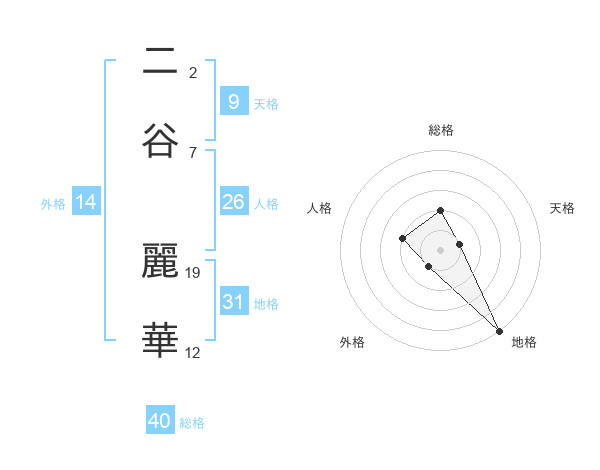 二谷 麗華さんの総格は40画の2点!
