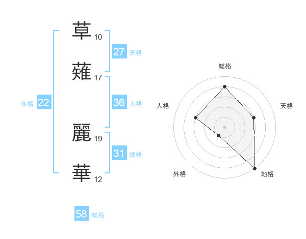 草薙 麗華さんを姓名の画数から五運を鑑定
