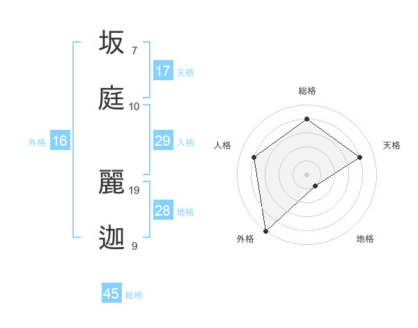 坂庭 麗迦さんの総格は45画の4点!