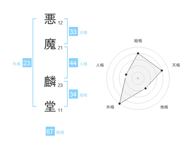 悪魔 麟堂さんの総格は67画の4点!