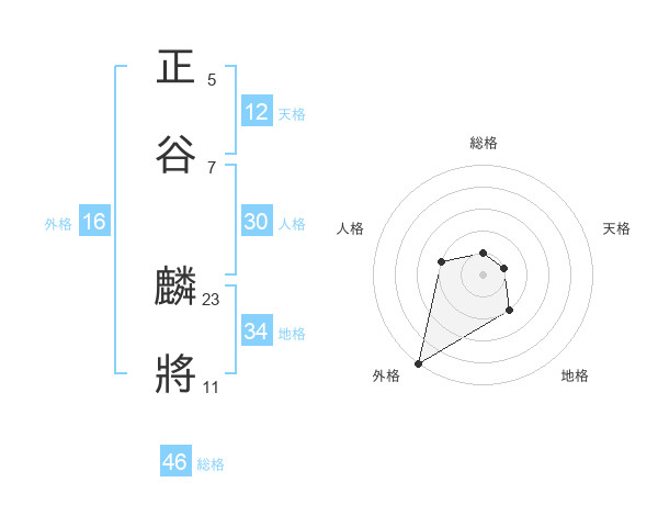 正谷 麟將さんの総格は46画の1点!