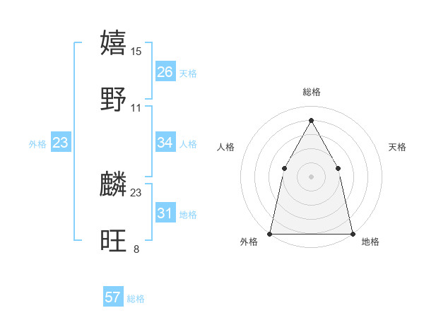 嬉野 麟旺さんの総格は57画の4点!