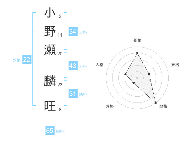 小野瀬 麟旺さんの総格は65画の4点