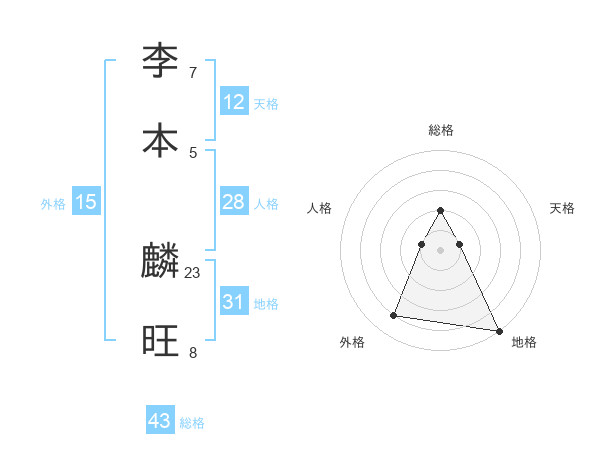 李本 麟旺さんの総格は43画の2点!