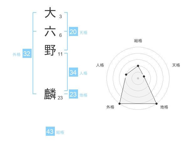 大六野 麟さんの総格は43画の2点!