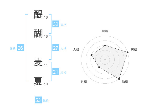 醍醐 麦夏さんの総格は53画の3点!