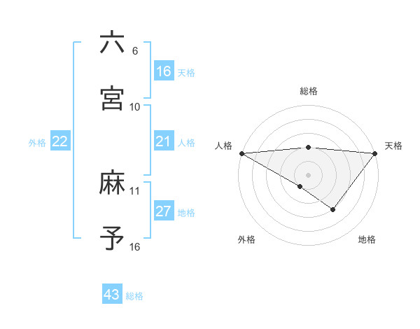 六宮 麻予さんの総格は43画の2点!