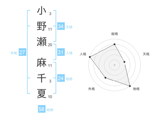 小野瀬 麻千夏さんの総格は58画の4点!