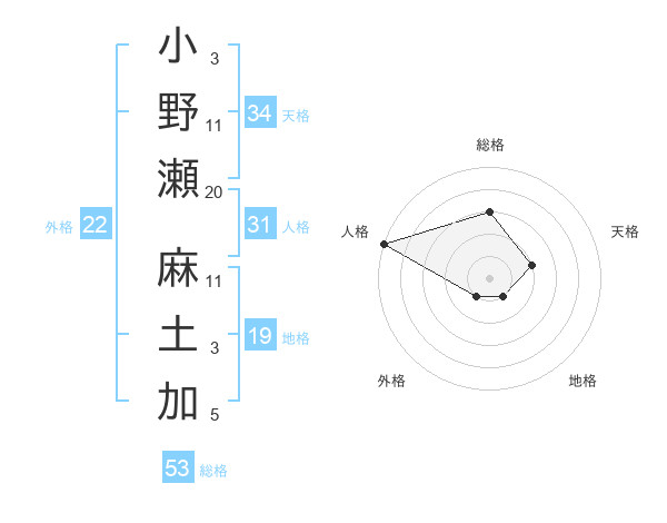 小野瀬 麻土加さんを姓名の画数から五運を鑑定