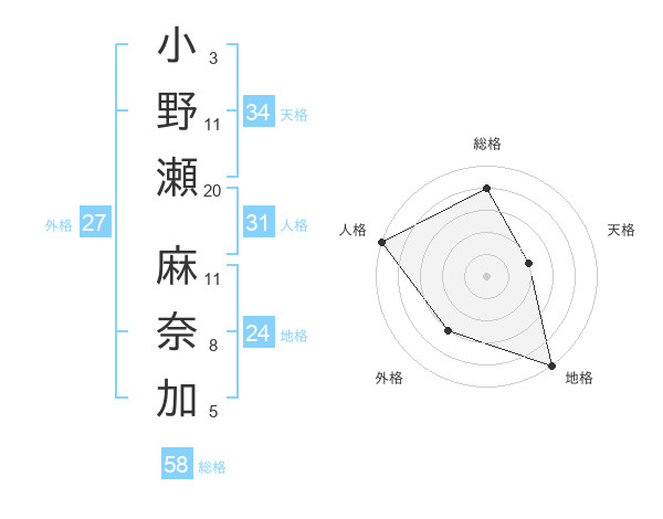 小野瀬 麻奈加さんを姓名の画数から五運を鑑定