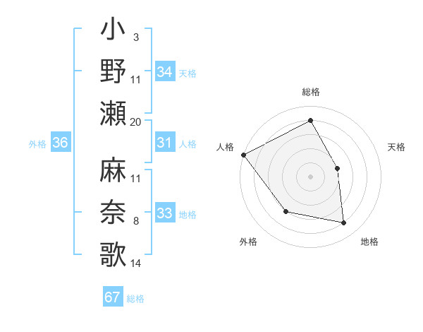 小野瀬 麻奈歌さんを姓名の画数から五運を鑑定