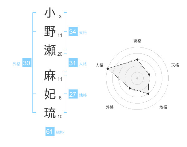 小野瀬 麻妃琉さんの総格は61画の3点!