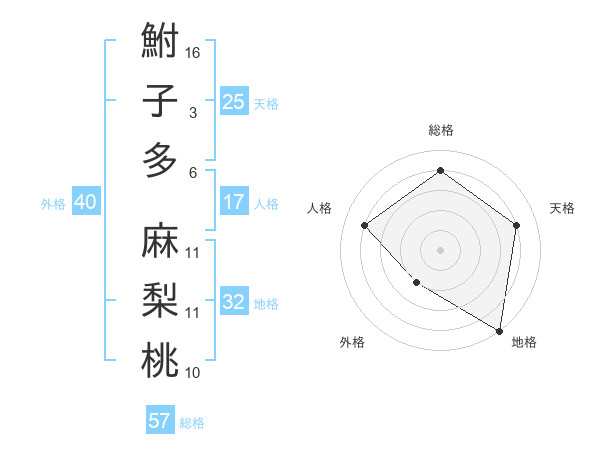 鮒子多 麻梨桃さんの地格は32画の5点!