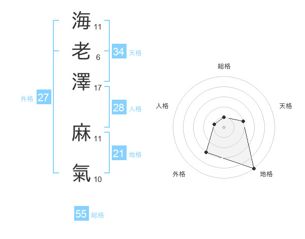 海老澤 麻氣さんの地格は21画の5点!