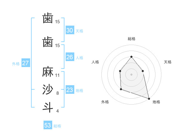 歯歯 麻沙斗さんの総格は53画の3点!