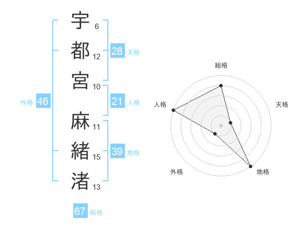 宇都宮 麻緒渚さんの総格は67画の4点!