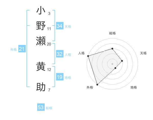 小野瀬 黄助さんを姓名の画数から五運を鑑定