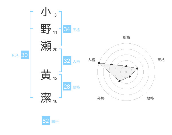 小野瀬 黄潔さんを姓名の画数から五運を鑑定