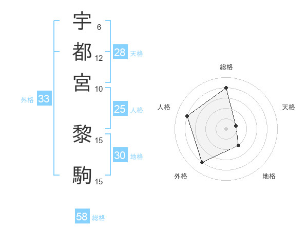 宇都宮 黎駒さんの総格は58画の4点!