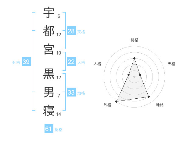 宇都宮 黒男寝さんを姓名の画数から五運を鑑定