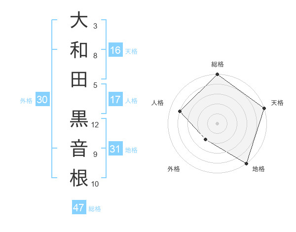 大和田 黒音根さんを姓名の画数から五運を鑑定