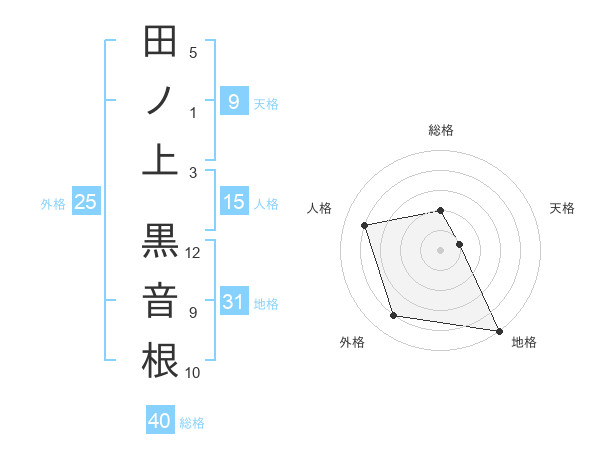田ノ上 黒音根さんを姓名の画数から五運を鑑定