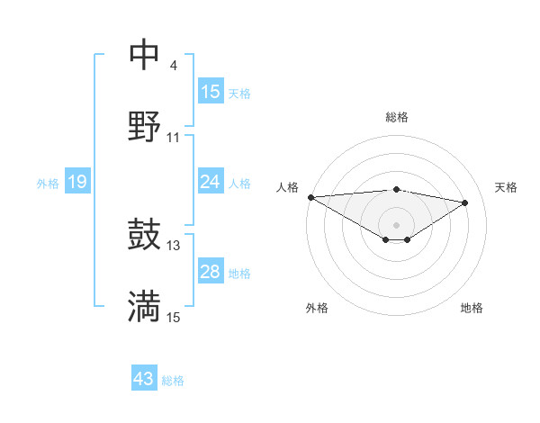 中野 鼓満さんの総格は43画の2点!