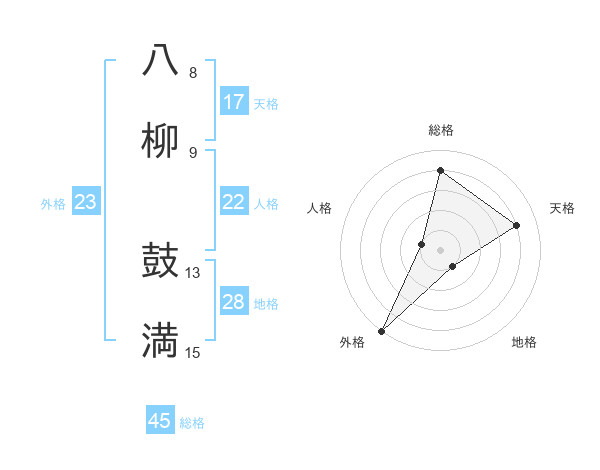 八柳 鼓満さんを姓名の画数から五運を鑑定