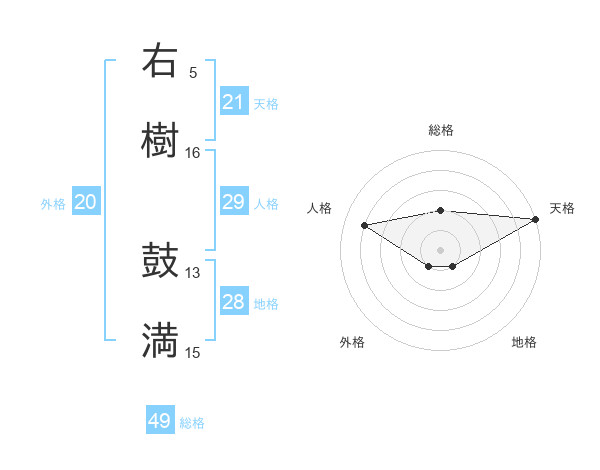 右樹 鼓満さんを姓名の画数から五運を鑑定