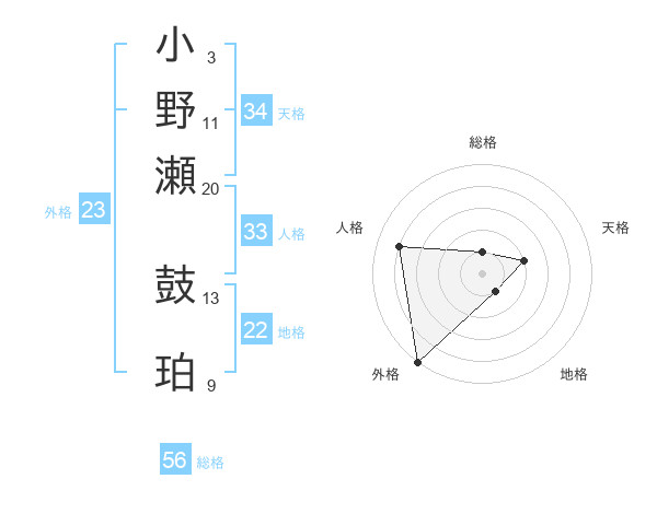 小野瀬 鼓珀さんの総格は56画の1点!