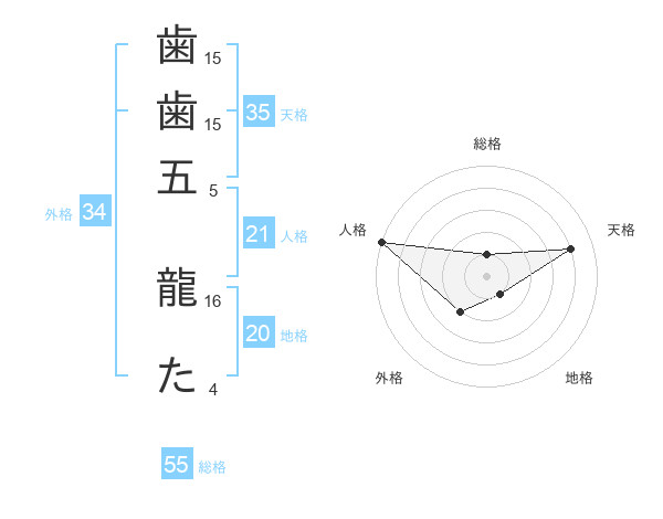 歯歯五 龍たさんの地格は20画の1点!