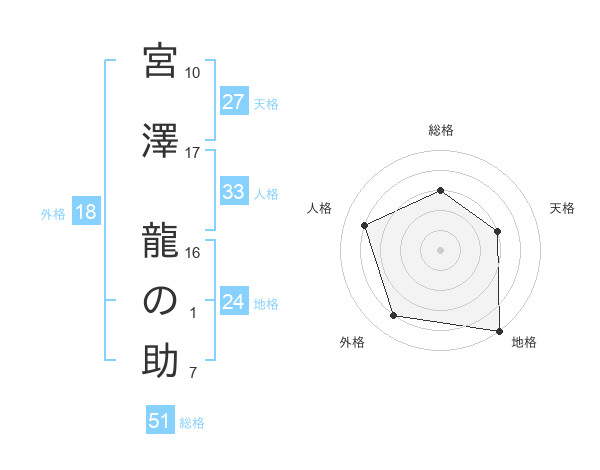 宮澤 龍の助さんを姓名の画数から五運を鑑定