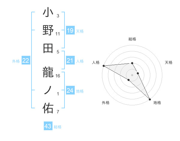 小野田 龍ノ佑さんの外格は22画の1点!