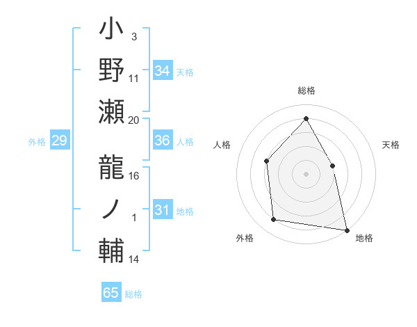 小野瀬 龍ノ輔さんの総格は65画の4点!