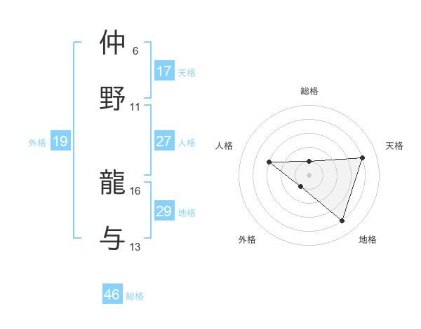 仲野 龍与さんを姓名の画数から五運を鑑定