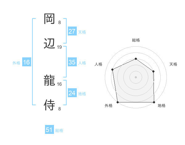 岡辺 龍侍さんの総格は51画の3点!