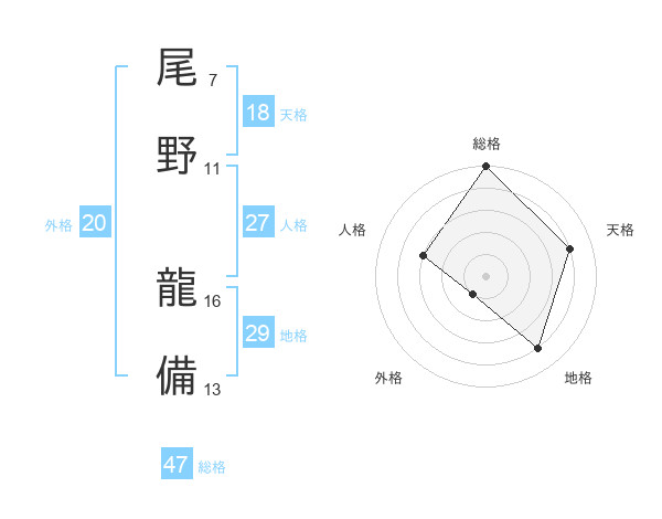 尾野 龍備さんの総格は47画の5点!