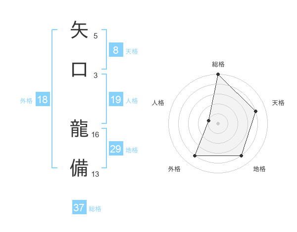 矢口 龍備さんの総格は37画の5点!