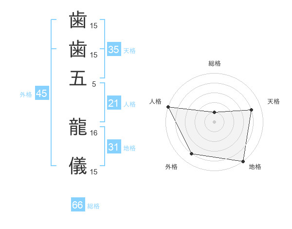 歯歯五 龍儀さんの総格は66画の1点!